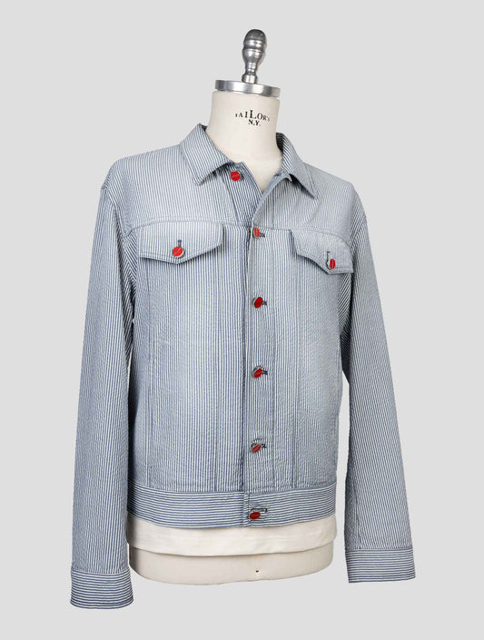Kiton Striped Cotton Coat - Light Blue White Leather Details