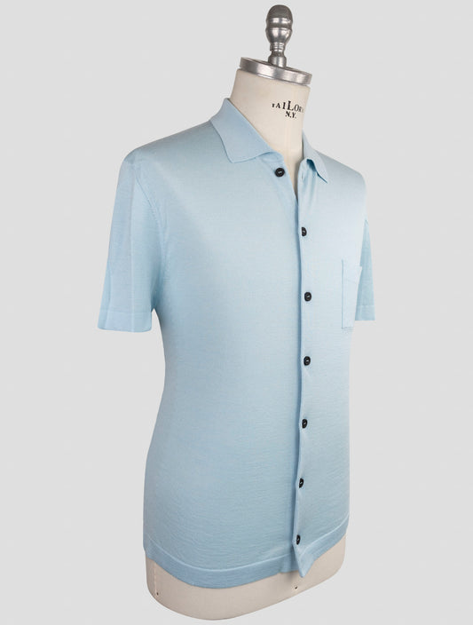 Kiton KNT Wool Silk Shirt Light Blue Handmade Italian Short Sleeve
